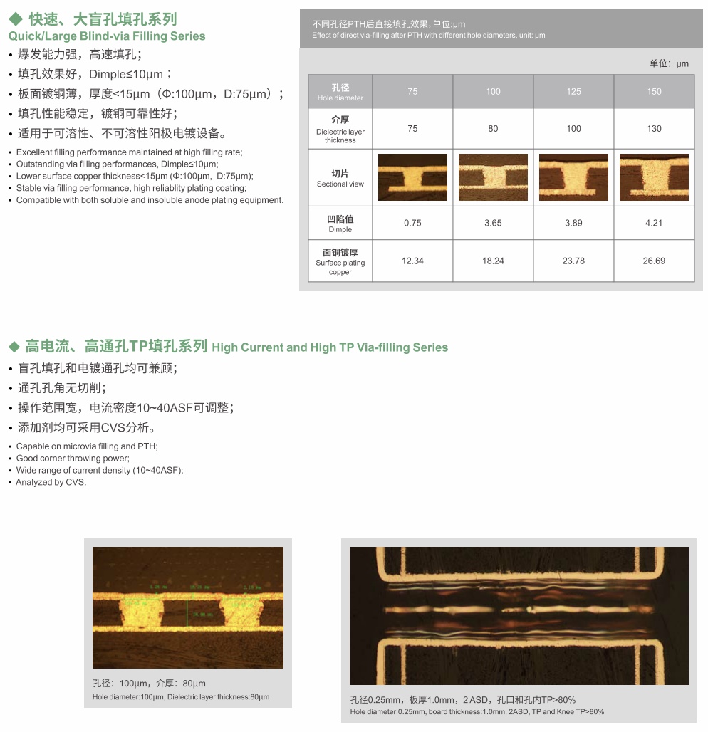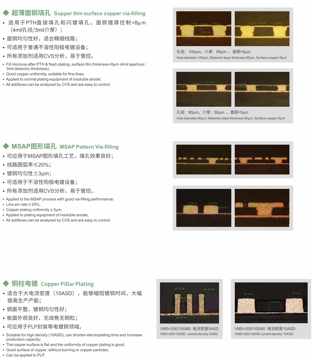 VFP系列是我司新一代填孔藥水,根據客戶不同應用場景和需求,形成了多個體系產品,如超薄面銅填孔、大電流密度高速填孔、MSAP圖形填孔、PLP封裝銅柱電鍍等。